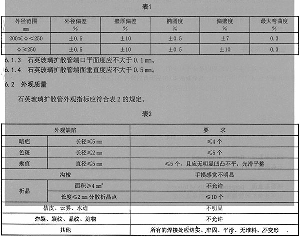 6.1.2石英玻璃擴(kuò)散管的外徑偏差、壁厚偏差、橢圓度、偏壁度及彎曲度應(yīng)符合表1的規(guī)定。